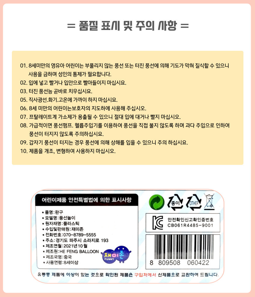 인증.허가 사항 어린이제품 특별법 대상(안전확인 대상)/한국건설생활환경시험연구원(KCL)/CB061R4485-9001